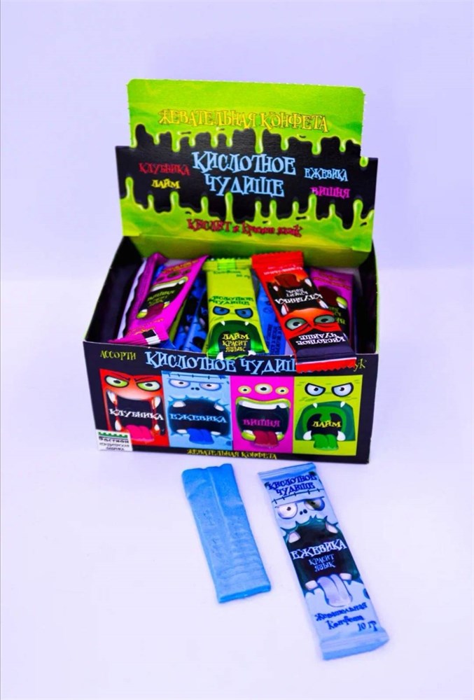 Описание Жевательная конфета"Кислотное чудище" с ароматами ежевики, вишни,лайма, клубники - это интересная для детей разновидность конфет, ее можно жевать, как жевательную резинку, а затем с удовольствием съесть, а ещё она красит язык