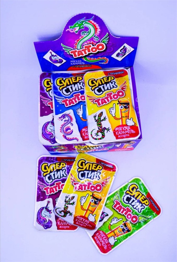 Описание Мягкая карамель "Супер стик с тату"- это вкусное лакомство для детей всех возрастов. Яркая карамель имеет богатую палитру вкусов, а стильные и яркие татуировки не оставят равнодушным