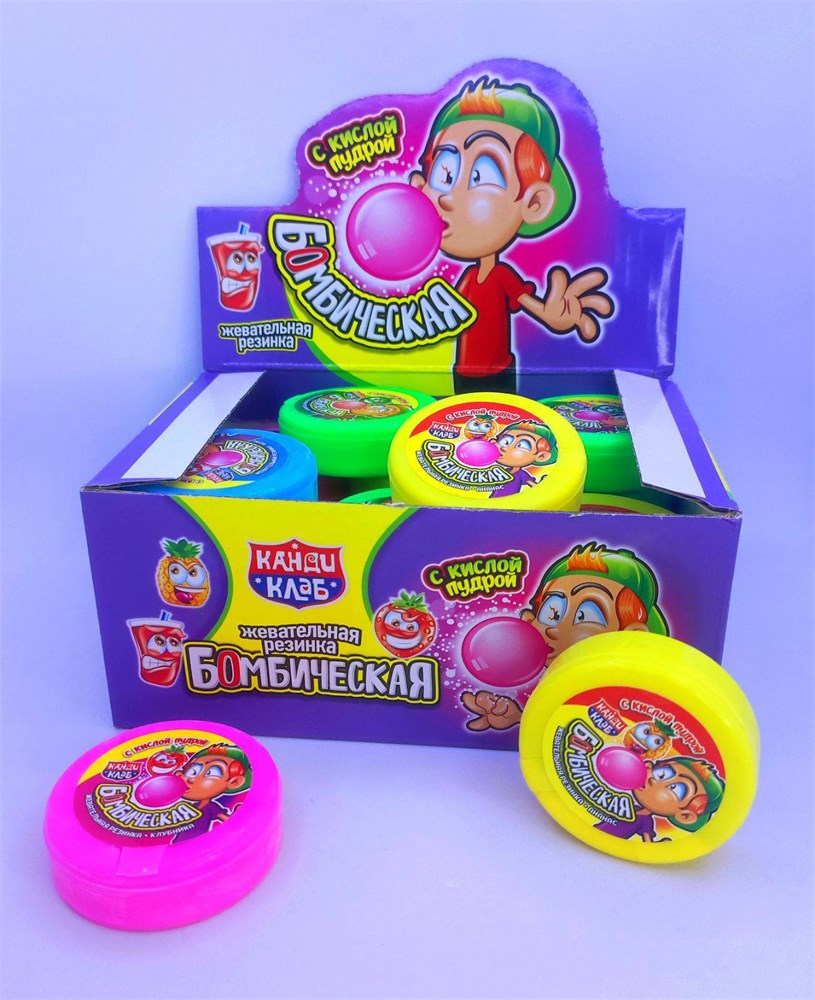 Описание Жевательная резинка с кислой пудрой "Бомбическая" имеет уникальный вкус и не менее уникальную упаковку. В упаковке 24 штуки, которые представлены в виде шайбы, а внутри вкусная жевательная резинка и кислая пудра